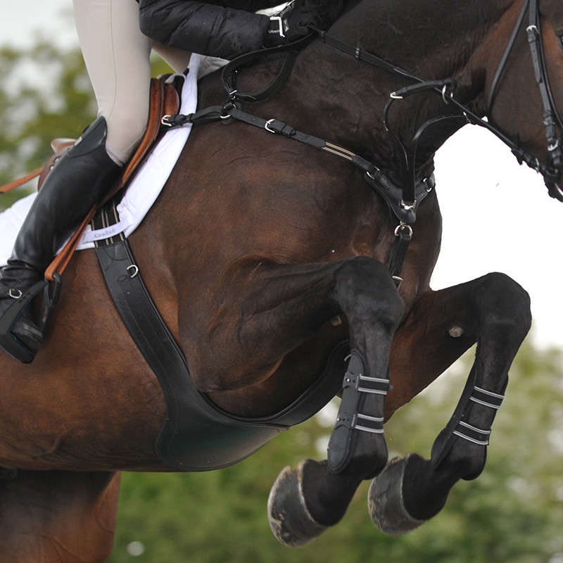 Zwykłe wytoki i napierśniki zwisają luźno między nogami konia, co może skutkować zaplątaniem się konia w paski i groźnym upadkiem. Popręg bezpieczny Kavalkade SecureX z 5- punktowym napierśnikiem pozwala na lepsze dopasowanie napierśnika, zapobiegając zaczepieniu się konia o pasy i zapewniając bezpieczeństwo.