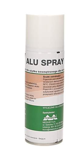 Alu Spray VMD to preparat w formie aerozolu przeznaczony do użytku zewnętrznego u zwierząt, takich jak psy, koty, konie czy zwierzęta gospodarskie. Stosowany jest do pielęgnacji ran, otarć, miejsc pooperacyjnych oraz urazów skóry. Spray tworzy na powierzchni skóry cienką, ochronną warstwę z mikronizowanego aluminium, która zabezpiecza ranę przed zabrudzeniami, wilgocią i wpływem czynników zewnętrznych. Dzięki temu wspomaga naturalny proces gojenia oraz ogranicza ryzyko infekcji bakteryjnych.