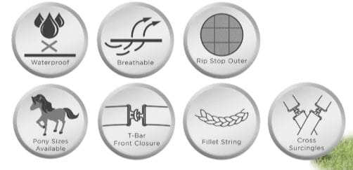 - Wodoodporna i oddychająca: derka jest wodoodporna (>5000 mm słup hydrostatyczny) i oddychająca (>3000 g/24h/m²), co chroni Twojego konia przed deszczem, jednocześnie zapewnia mu komfort termiczny.
