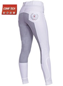 Modne bryczesy damskie z pełnym lejem 3/4 z elastycznego, bardzo trwałego syntetycznego zamszu COMFiTECH®. Elastyczne zakończenie nogawek. Ozdobne, kontrastowe stebnówki nadają im sportowego stylu. Cztery funkcjonalne kieszenie. Na tylnej kieszonce ozdobny haft.