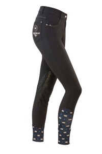 Bryczesy jeździeckie wykonane z nowoczesnych tkanin w dwóch oryginalnych wzorach do wyboru - piękny motyw kwiatowy lub modne korony. Posiadają dwie kieszonki z przodu oraz z tyłu - zdobione kontrastową nitką, kryształkami i oryginalnym haftem. Pełny lej silikonowy lub kolanowy i elastyczne wstawki w nogawkach zdobione grafiką.