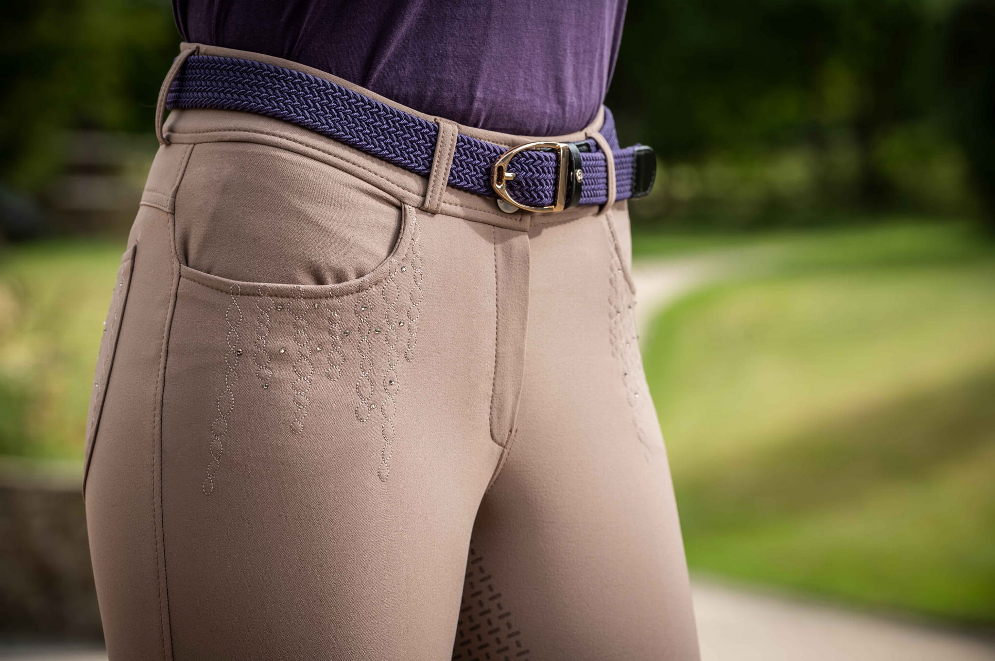 Eleganckie i komfortowe bryczesy wykonane z elastycznego, technicznego materiału, który jest mocno rozciągliwy i przyjazny dla skóry. Oddychająca, przewiewna tkanina szybko odprowadza wilgoć i błyskawicznie wysycha. Silikonowy pełny lej zapewnia dobrą przyczepność w siodle a wysoki stan podkreśla sylwetkę oraz wspomaga prawidłowe ułożenie pleców. Bryczesy wyposażone w dwie pojemne kieszenie z przodu i dwie z tyłu, ozdobione eleganckimi, oryginalnymi przeszyciami oraz drobnymi kryształkami. Nogawki zakończone elastycznymi mankietami, które dobrze przylegają do kostki i ułatwiają zakładanie oraz zdejmowanie bryczesów.