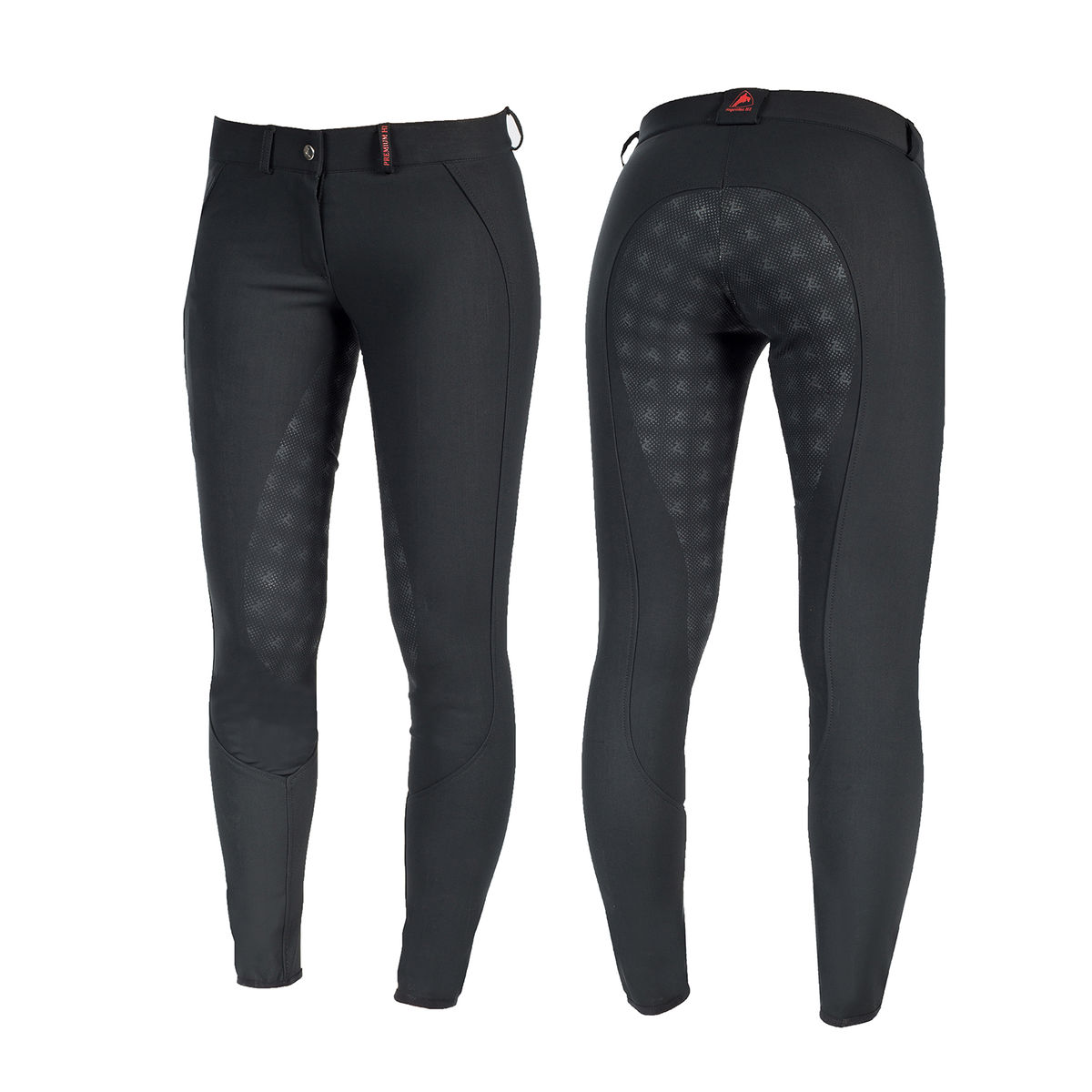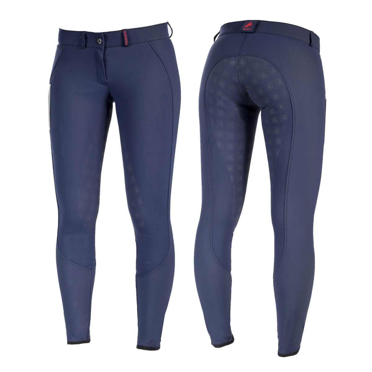 Bardzo wygodne bryczesy pokryte silikonem dla lepszego kontaktu z siodłem. Oddychający, gładki materiał odpiera brud i wodę, materiał rozciągliwy w dwóch kierunkach dla ułatwienia ruchów. Zapięcie na guzik daje dodatkowy komfort przy zakładaniu i sprawia, że spodnie wyglądają trendy. Krój pozbawiony szwów od wewnątrz co bardzo podnosi komfort i zapobiega obtarciom. Na prawej nogawce, z przodu na udzie wszyta jest kieszeń na telefon. Jest to bardzo wygodne rozwiązanie -łatwy dostęp do telefonu i nie przeszkadza w jeździe konnej.