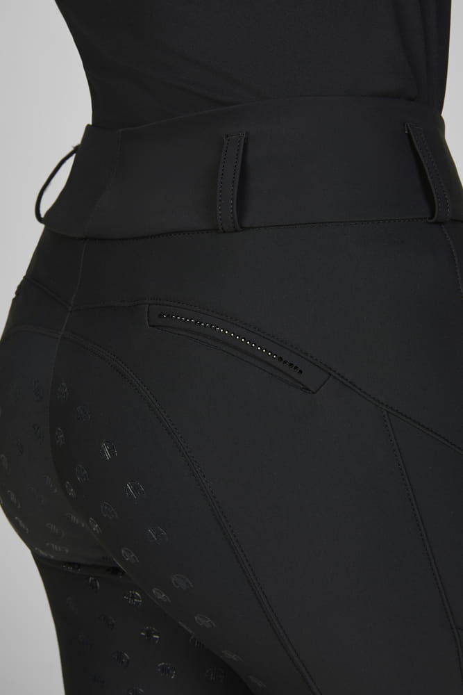 Pełny lej silikonowy w technologii „screen-print” zapewnia optymalną przyczepność w siodle, nie ograniczając przy tym elastyczności materiału. Po bokach bryczesów znajdują się ozdobne lampasy oraz praktyczna, dyskretna kieszeń na telefon. Tył zdobią eleganckie patki z subtelnymi kryształkami, które nadają całości stylowego wyrazu.