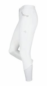 Eleganckie , klasyczne białe bryczesy do jazdy konnej idealne na zawody jeździeckie. Wysoki stan podkreśla sylwetkę a pełny, silikonowy lej pokryty antypoślizgowym żelem w technologii COMFISTICK™ poprawia przyczepność w siodle. Kieszenie ozdobione dyskretną aplikacją z kryształków w kolorze różowego złota. Na udzie subtelne zdobienie logiem marki Fair Play. Bryczesy zakończone dołem elastyczną nogawką.