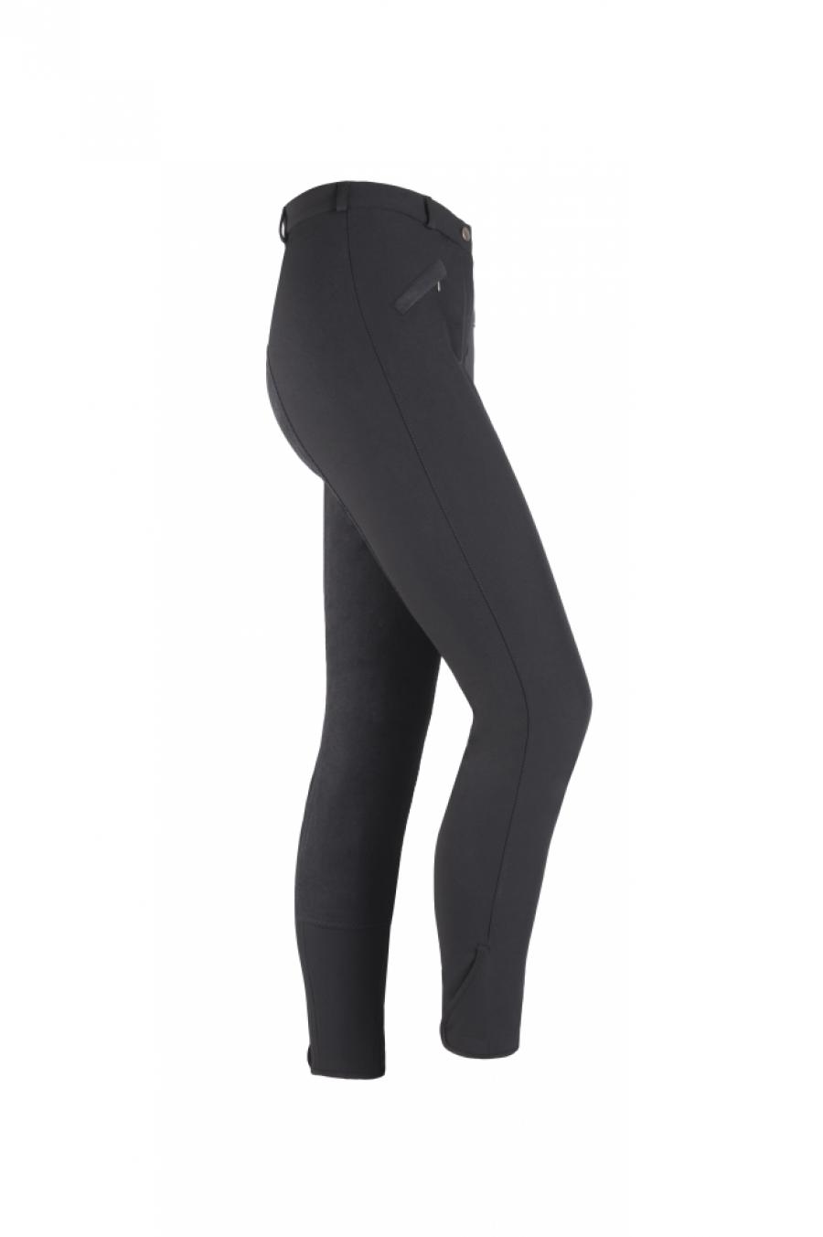 Damskie bryczesy z pełnym lejem ze sztucznej skóry , idealne na zimowe przejażdżki konne. Wykonane z elastycznego, przepuszczającego powietrze, wysokiej jakości materiału typu softshell, który odrzuca wilgoć i brud. Posiadają dwie kieszonki z przodu zapinane na zamek. Dół nogawek zakończony ściągaczem na rzep dla lepszego dopasowania. Wnętrze spodni wykończone miękkim materiałem.