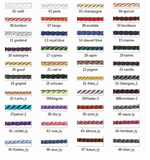 Prosimy o podanie sznurków w kolejności od zewnątrz czapraka: biały 01, perłowy 02, szampański 03, złoty 20, beżowy 21, kukurydziany 31, brzoskwiniowy 04, cukierkowy 06, różowy 42, ciemno różowy 43, malinowy 44, lachs 33, tango 07, jasno czerwony 08, bordowy 10, jasny liliowy 35, liliowy 38, fioletowy 41, oberżyna 16, jagodowy 36, jasno zielony 34, cyprysowy 17, sapin 18, tanne 19, petrol 37, lodowy 45, niebieski mundurowy 14, niebieski chabrowy 13, granatowy 15, aqua 40, azur 46, titan 48, szary gołębi 22, zimt 39, brązowy 47, waniliowy 23, goeland 11, ciemno szary 32, grafitowy 24, czarny 25. Nić użyta do pikowania czapraka będzie w tym samym kolorze co zewnętrzny sznurek.