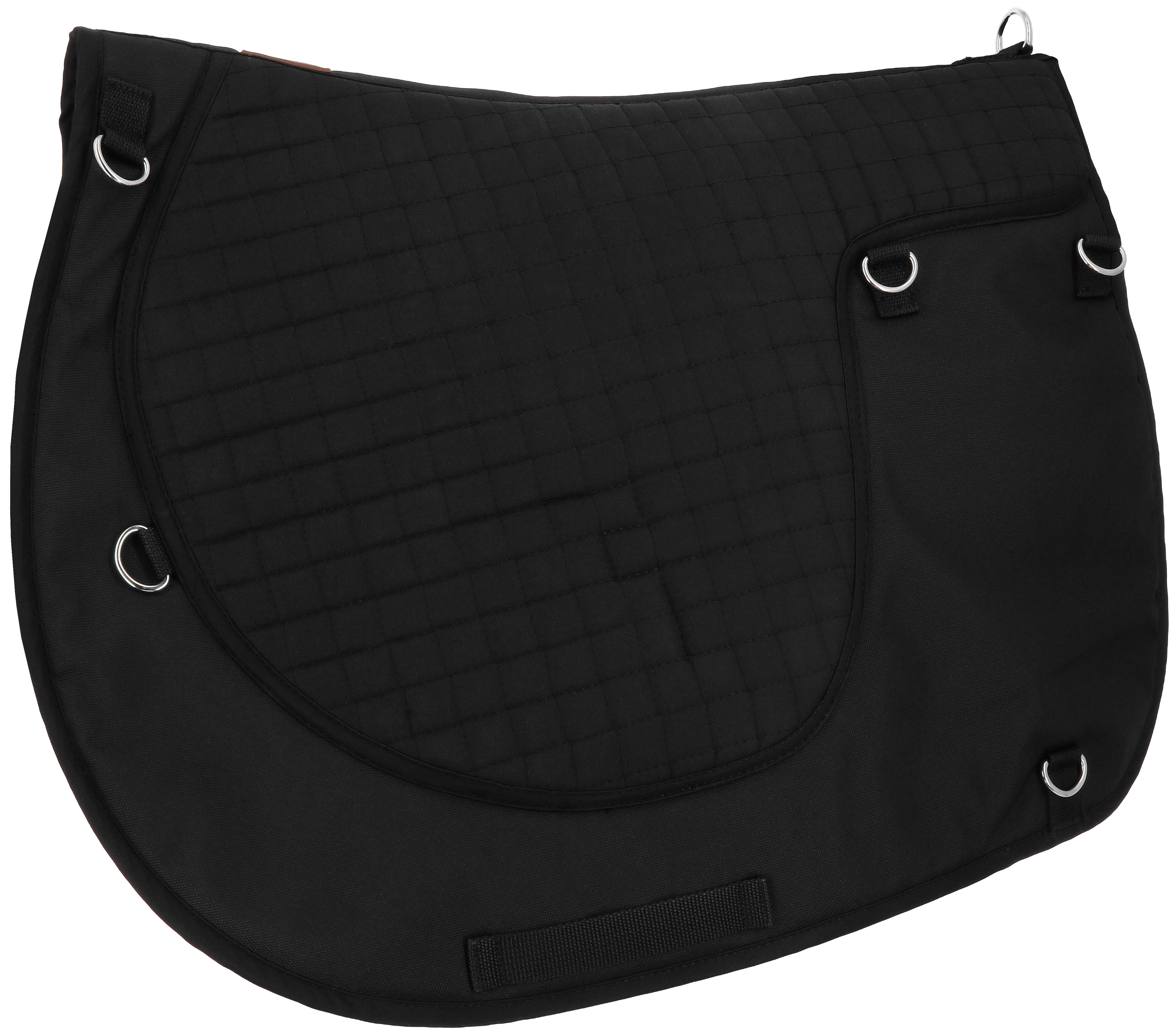 Praktyczny czaprak na wyprawy konne. Wyposażony w odpinane torby: 2 mniejsze z przodu i 2 większe tylnie. Posiada liczne D-ringi umożliwiające troczenie.