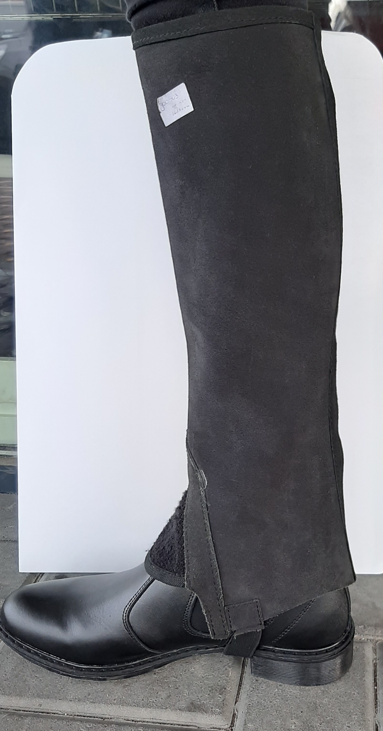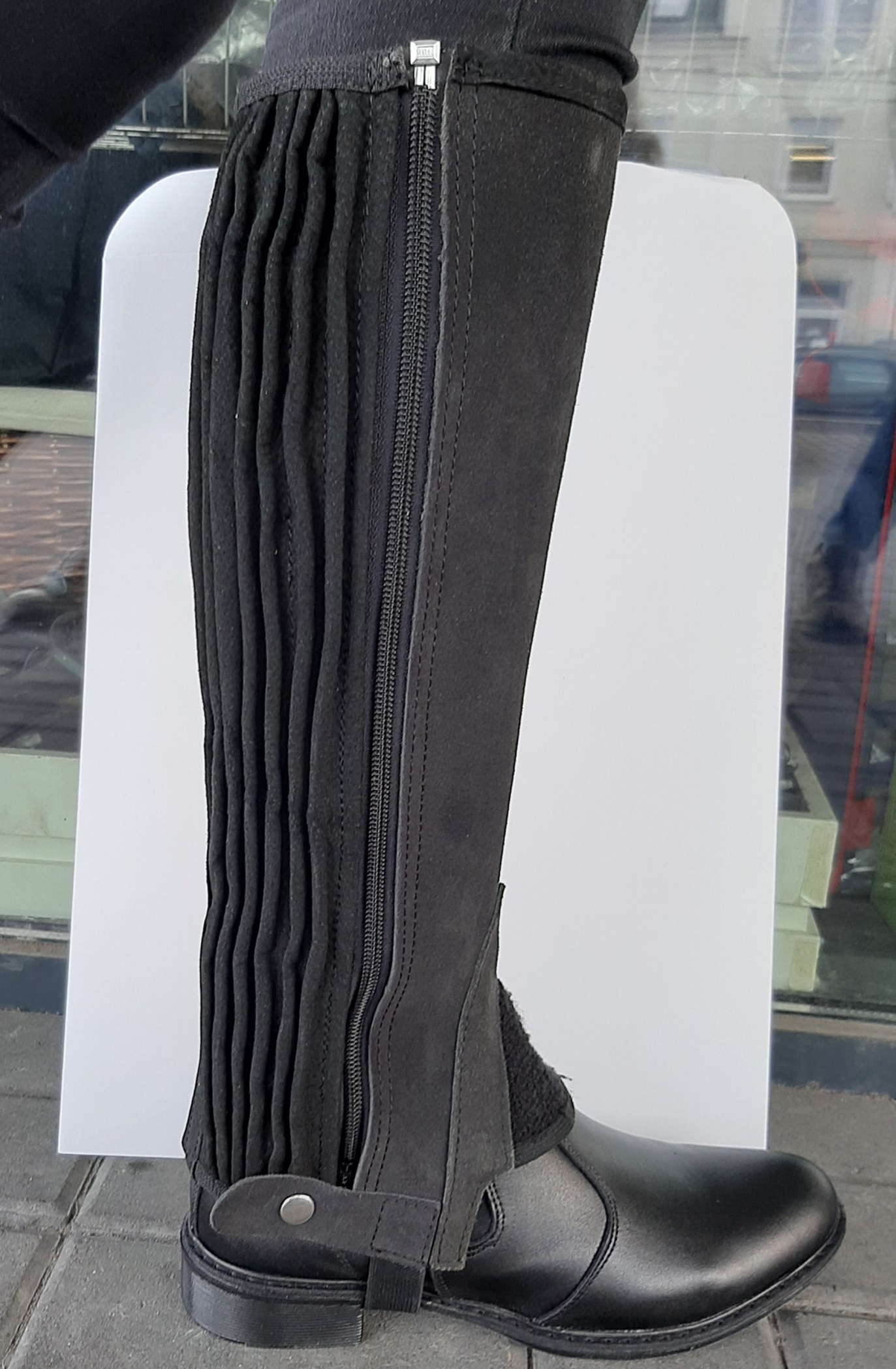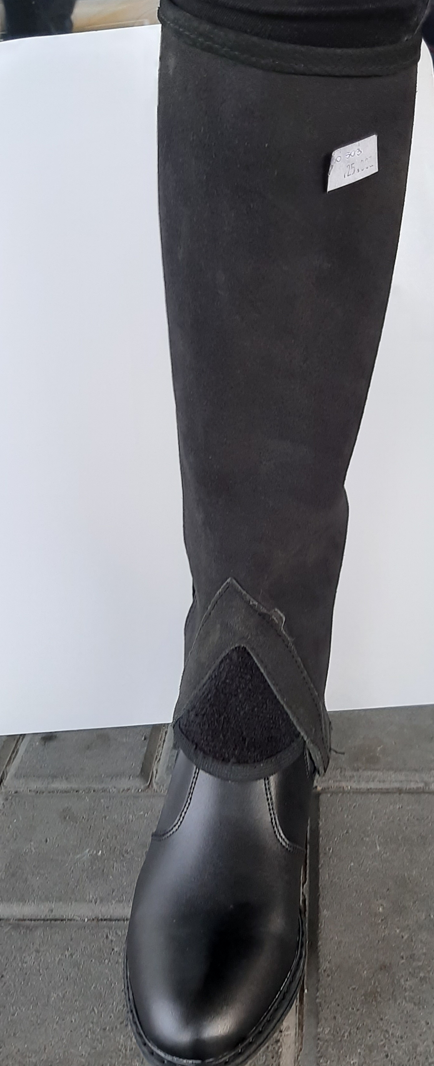 Czapsy wykonane ze skóry zamszowej. Posiadają plisowaną ,elastyczną wstawkę na całej długości, zapięcie na zamek błyskawiczny, u góry rzep.