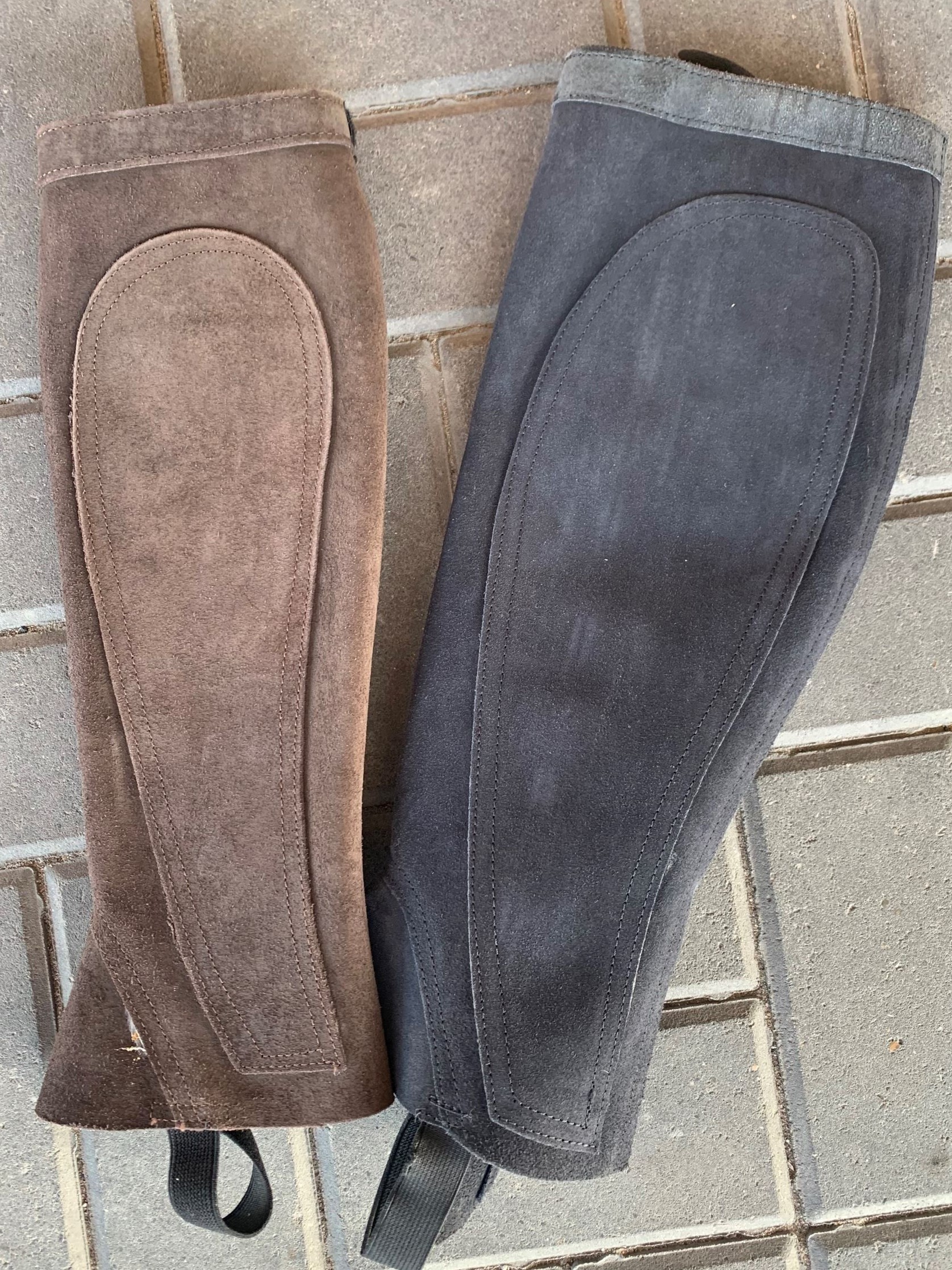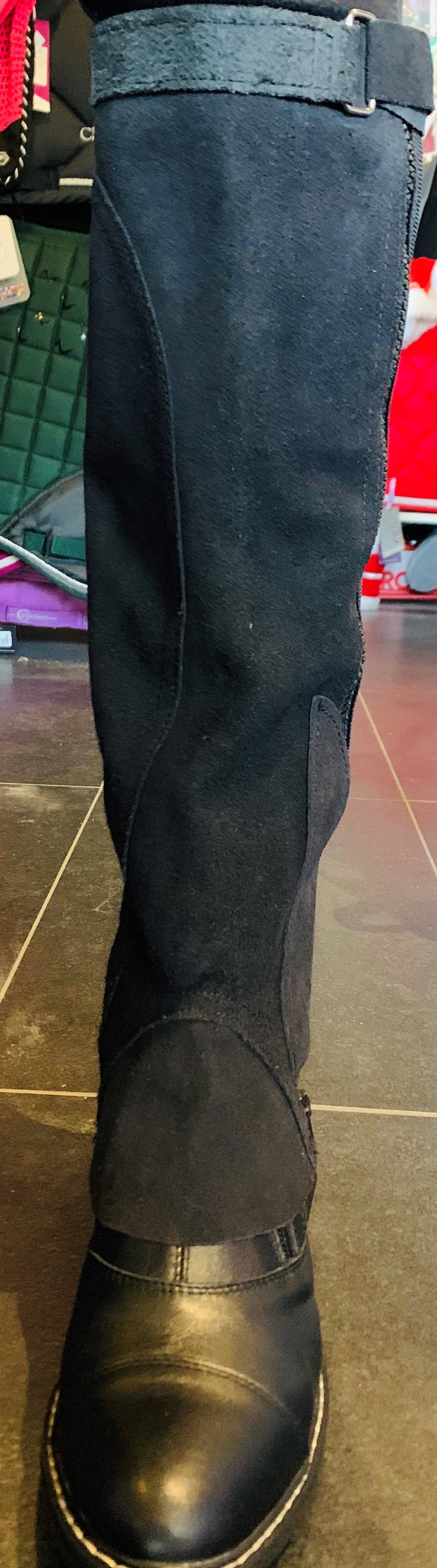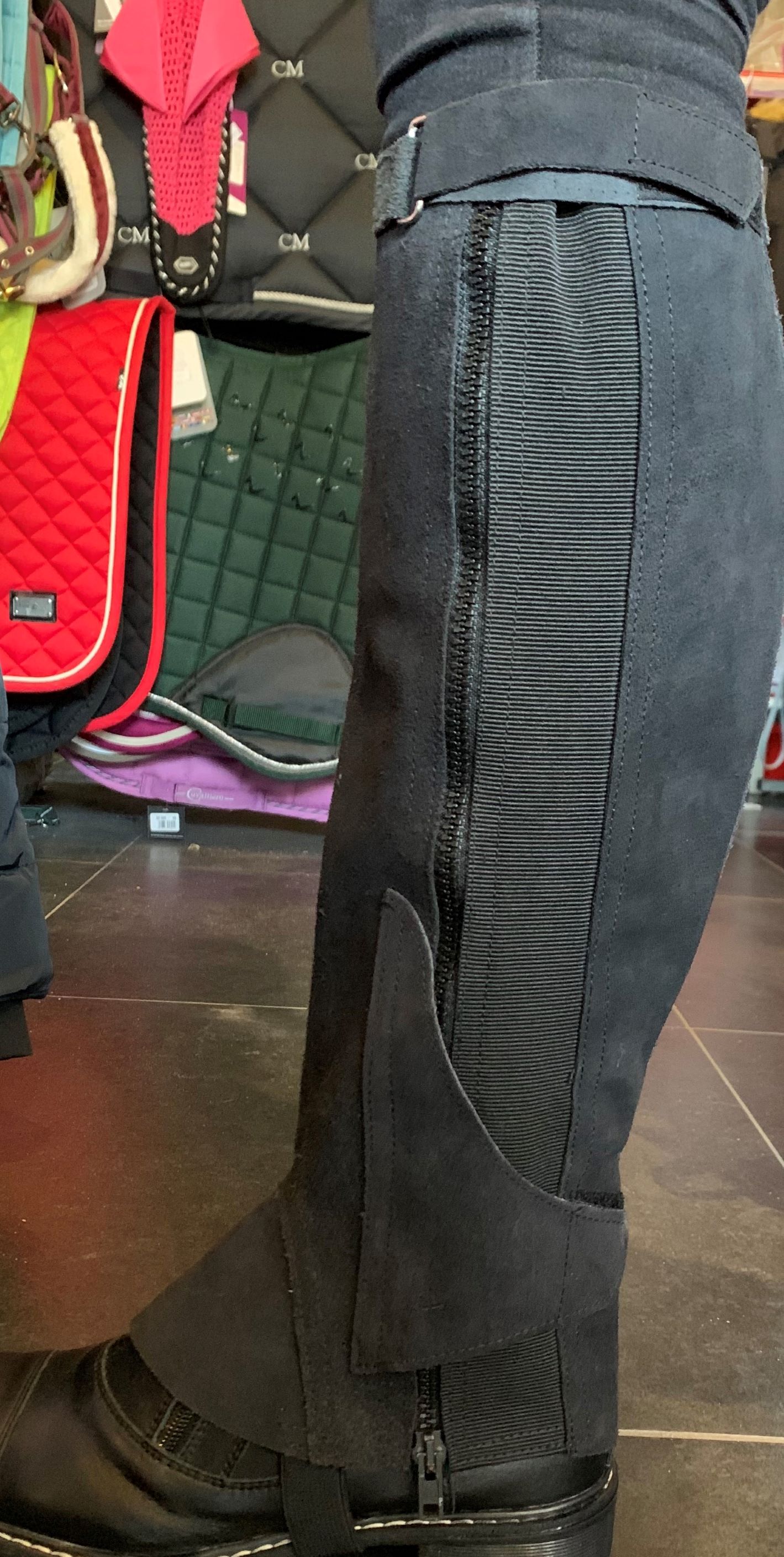 Klasyczny model czapsów jeździeckich , wykonany z wysokiej jakości skóry zamszowej, usztywnianej. Materiał odporny na uszkodzenia mechaniczne i wycieranie się. W bocznej części czapsów, na całej długości wszyta elastyczna, gumowa wstawka wzdłuż zamka, na dole oraz na górze zapinane na rzep. Dzięki wyprofilowaniu wspaniale dopasowują się do łydki zapewniając wysoki komfort podczas użytkowania.