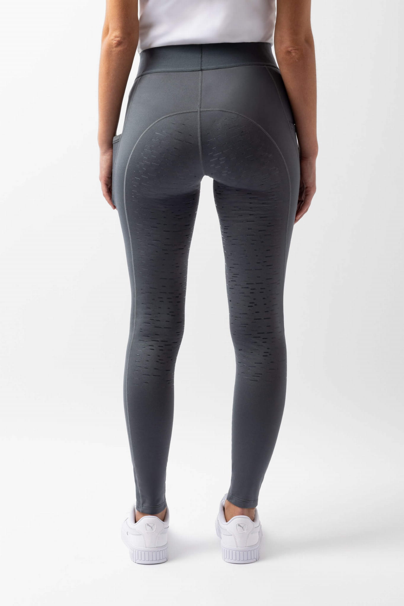 Wygodne legginsy jeździeckie z miękką, przyjemną dla ciała, czesaną podszewką to idealne bryczesy na sezon przejściowy. Fason z wysokim stanem doskonale modeluje sylwetkę, a przy tym nie trzeba się obawiać, że legginsy zsuną się podczas jazdy. Kieszenie na udach, ozdobione silikonowym nadrukiem w kolorze tła, pomieszczą najpotrzebniejsze drobiazgi. Pełny , silikonowy lej ułatwia przyjęcie prawidłowego dosiadu i poprawia przyczepność w siodle.