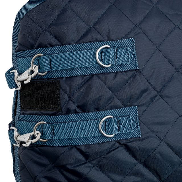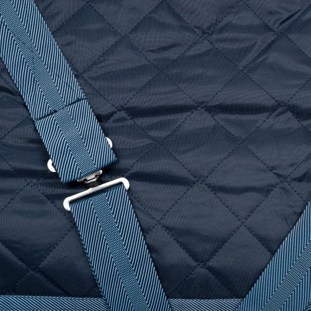Derka wykonana z wytrzymałej tkaniny o gramaturze 210 denierów (210d), co sprawia, że jest ona odporna na zużycie i działanie czynników zewnętrznych. Derka utrzymuje się w doskonałym stanie nawet przy intensywnym użytkowaniu, co jest niezwykle istotne w warunkach stajennych. Posiada wypełnienie 100 g, co zapewnia umiarkowaną izolację termiczną w chłodniejsze dni. Pasy krzyżowe i pasy na nogi zapobiegają przesuwaniu się derki podczas ruchu konia i utrzymują ją na miejscu.