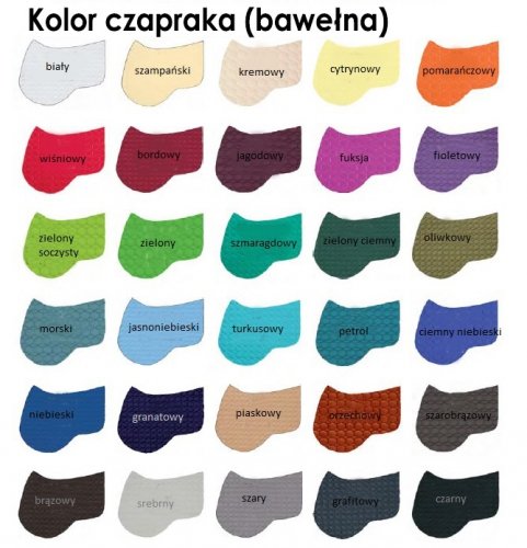 Na początku wybierz wersje podkładki: dresażową, skokową lub wszechstronną i rozmiar (tabela w galerii, rozmiary opisane powyżej). Potem wybierz kolor quiltu, wybierz opcję z futrem od spodu, z obszyciem z przodu i z tyłu oraz kolor futerka ( jeżeli wybiorą państwo inny kolor niż naturalny i czarny prosimy zaznaczyć w uwagach do zamówienia), następnie wybierz kolor lamówki ( w uwagach do zamówienia). Podkładkę można wyposażyć w opcje dodatkowe :