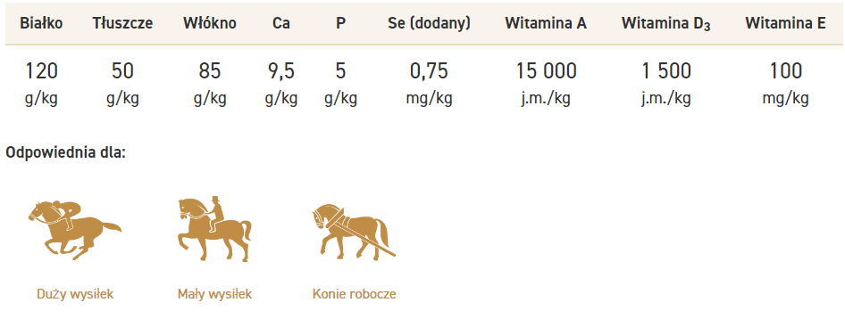 Dla koni hodowlanych, sportowych o dużym obciążeniu pracą. Odpowiednia dla koni użytkowanych w sporcie (skoki) i wyścigi.
