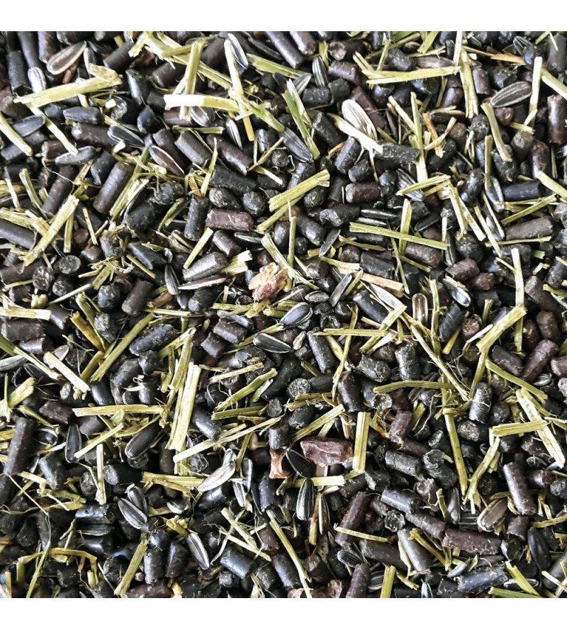 Skład: 29,6 % mączka z lucerny, 16,8 % otręby ryżowe, 14,4 % poekstrakcyjna śrut słonecznikowa, 14,4 % makuch lniany, 8,3 % lucerna, 6,0 % olej z ostropestu plamistego, 6,0 % ziarno słonecznika, 1,9 % melasa z trzciny cukrowej, 1,9 % chleb świętojański kruszony 124 g/kg białko og. strawne 12,5 MJ/kg energia strawna