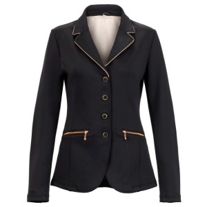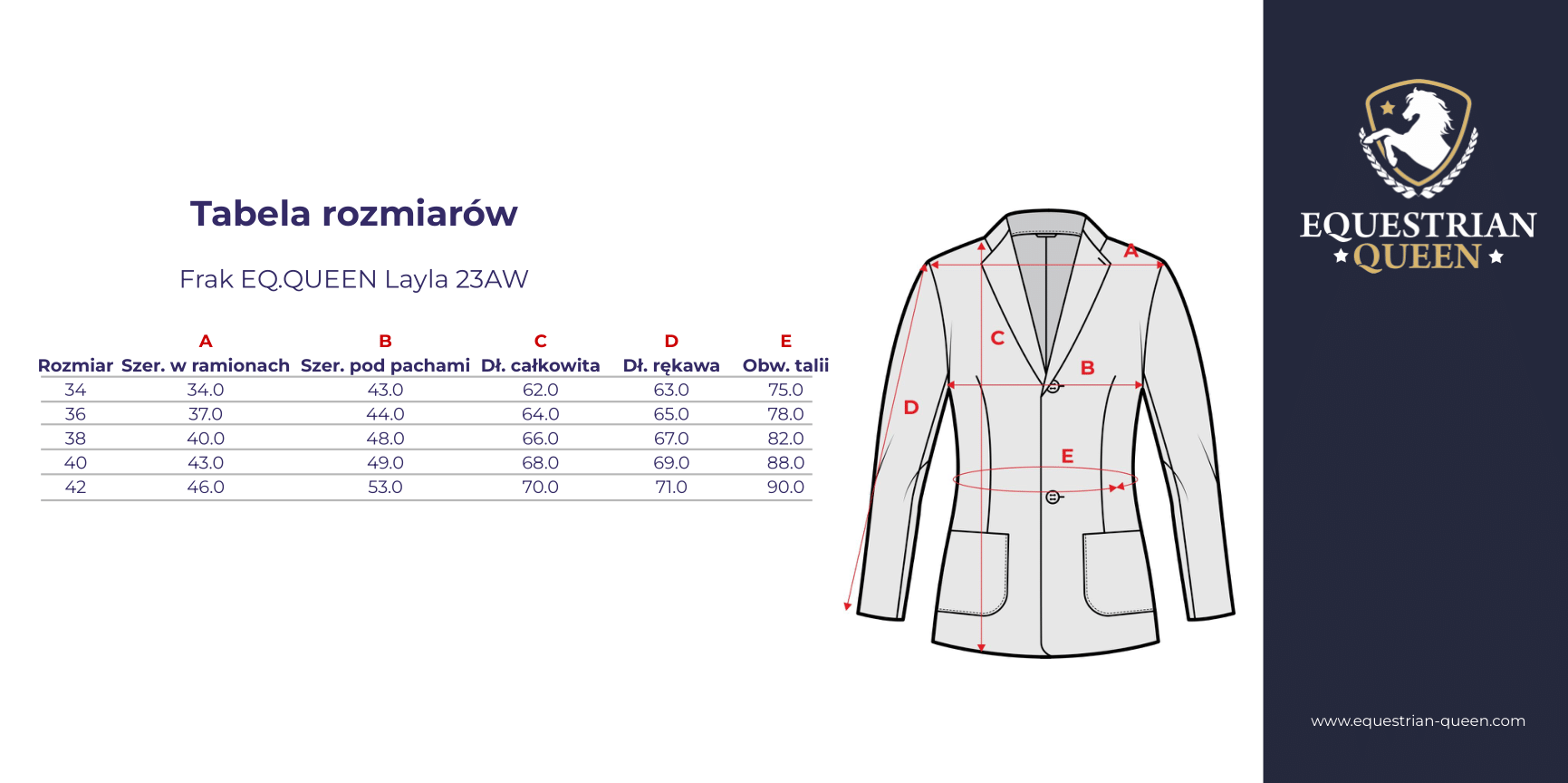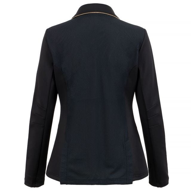 Niezwykle elegancki damski frak konkursowy wykonany z elastycznego, oddychającego i przyjemnego w dotyku materiału technicznego. Dzięki zastosowaniu elastanu frak doskonale dopasowuje się do kobiecej sylwetki zapewniając tym komfort i swobodę ruchów podczas użytkowania. Zapinany przy pomocy sprytnie ukrytego zamka oraz kryształkowe guziki, które nadają mu stylu. Tył fraka uszyty jest z drobnej siateczki dla jeszcze lepszej wentylacji.
