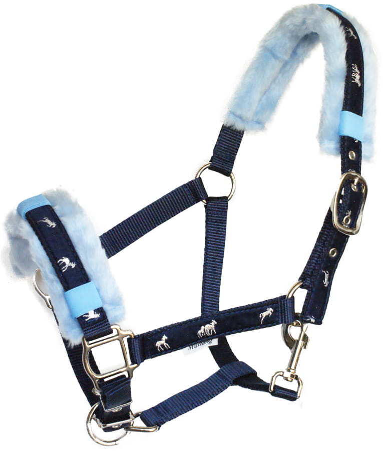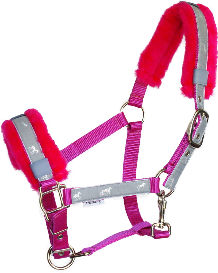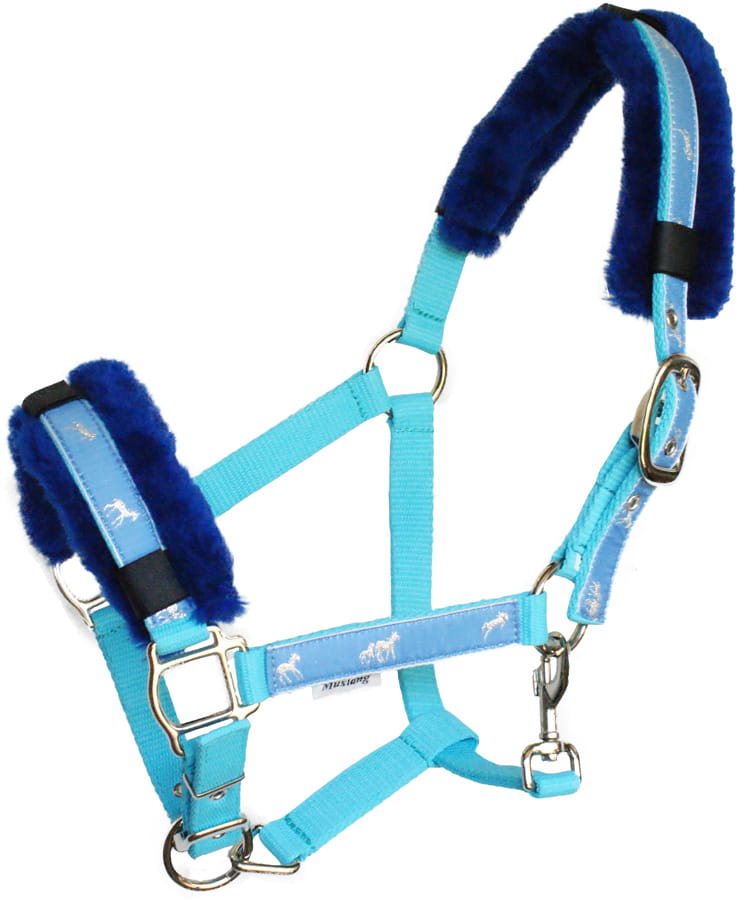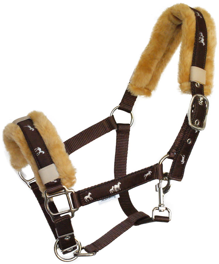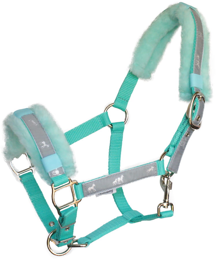 Elegancki i komfortowy kantar wykonany z mocnej taśmy. Ozdobiony dodatkowo naszytą taśmą we wzór w koniki. W części potylicznej i nachrapnikowej posiada podkładki ze sztucznego futerka w pasujących kolorach, zapinane na rzepy. Dzięki takiemu rozwiązaniu można je łatwo zdejmować do prania. Mocne okucia w kolorze srebrnym. Dostępny w 5-ciu rozmiarach i wielu atrakcyjnych kolorach.