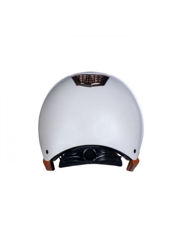 Kask wykonany jest z lekkich, ale wytrzymałych materiałów, co zapewnia bezpieczeństwo bez obciążenia głowy. Design kasku charakteryzuje się subtelnymi ale eleganckimi detalami. Połyskująca powierzchnia, delikatne zdobienia i skórzany daszek nadają mu nowoczesny, a jednocześnie klasyczny wygląd. Dodatkowo, system regulacji znajdujący się z tyłu głowy zapewnia idealne dopasowanie do kształtu głowy, zwiększając komfort i stabilność. Wnętrze kasku wyposażone jest w wyjmowaną i wentylowaną wyściółkę, która poprawia komfort i umożliwia łatwe utrzymanie czystości. Zapięcie pod brodą z systemem łatwego zapinania i regulacji podnosi funkcjonalność.
