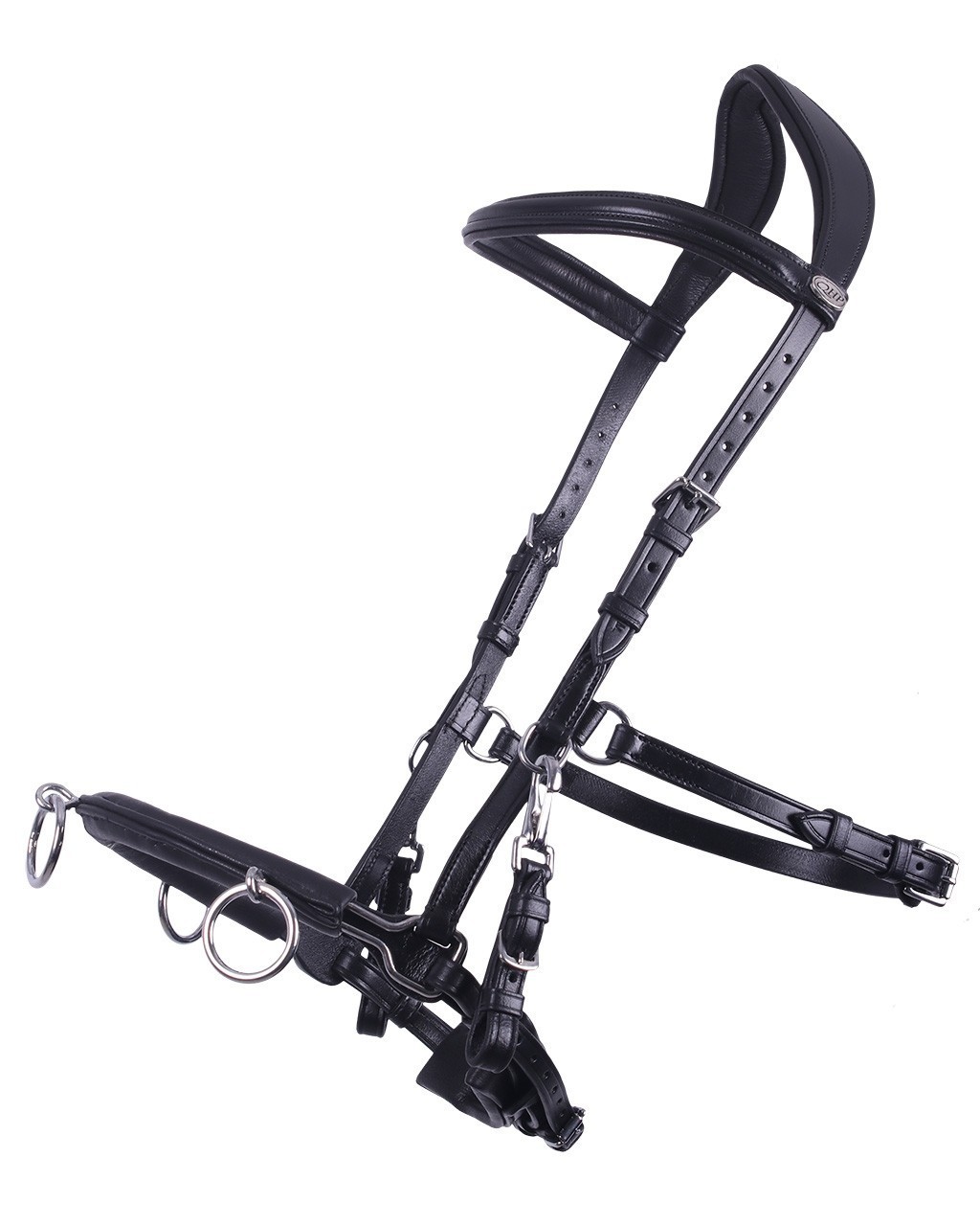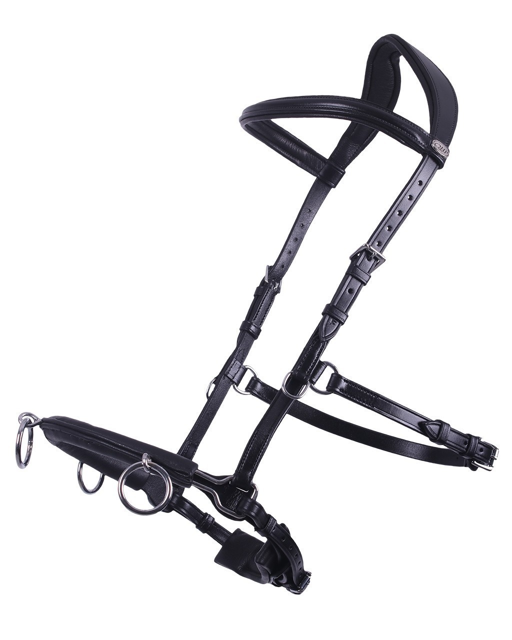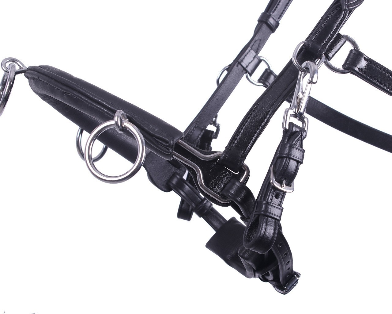 Wysokiej jakości, wykonany z miękkiej skóry bydlęcej, kawecan do pracy z koniem z ziemi oraz na lonży. Posiada anatomicznie wyprofilowany pasek potyliczny uwalniający przestrzeń u podstawy ucha, dzięki czemu idealnie sprawdzi się dla koni wrażliwych w tych miejscach. Wyposażony w mocne jarzmo o odpowiedniej wadze obszyte skórą z trzema mocnymi kółkami do wypięcia. Miękko podszyty pasek potyliczny oraz naczółek (który w razie potrzeby można wymienić) zapewniają wysoki komfort podczas użytkowania. Sprzedawany w komplecie z paskami do wędzidła, dopinanymi przy pomocy karabińczyków. Regulowany na nachrapniku, pasku potylicznym i pasku podgardlanym. Okucia wykonane ze stali nierdzewnej w kolorze srebrnym.