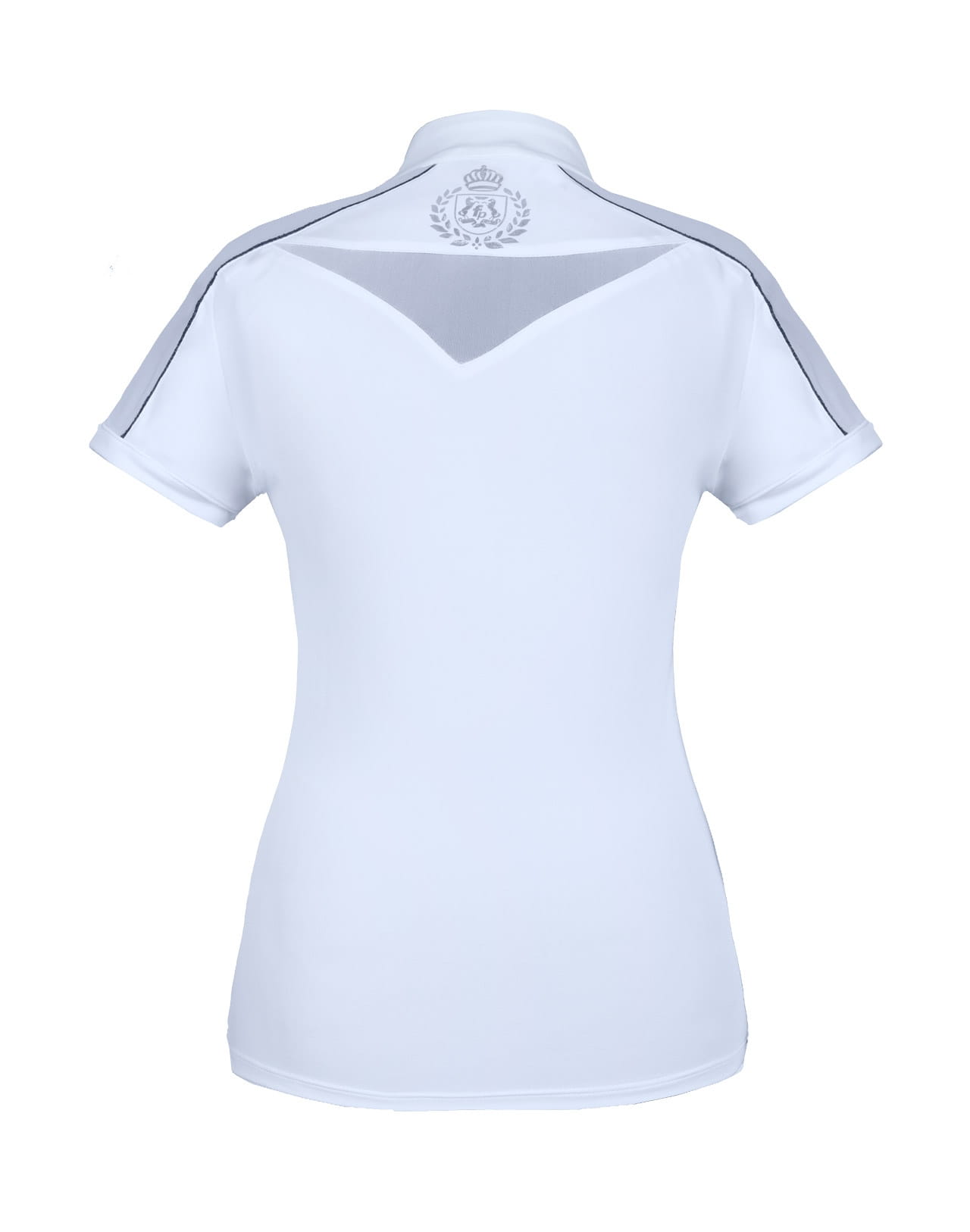Na rękawkach oraz z tyłu na plecach posiada wstawki z leciutkiej sdiateczki, dzięki którym jeszcze lepiej przepuszcza powietrze. Materiał jest szybko schnący i szybko odprowadza wilgoć na zewnątrz. Taliowany krój idealnie podkreśla kobiecą sylwetkę, jednocześnie zapewniając swobodę ruchu i wysoki komfort podczas użytkowania. Koszula ozdobiona perłową taśmą na plisie oraz logo marki na piersi wyklejone drobnymi, odbijającymi światło diamencikami w kolorze srebrnym. Dzięki zastosowanym ozdobom koszula ma niepowtarzalny styl i elegancję.
