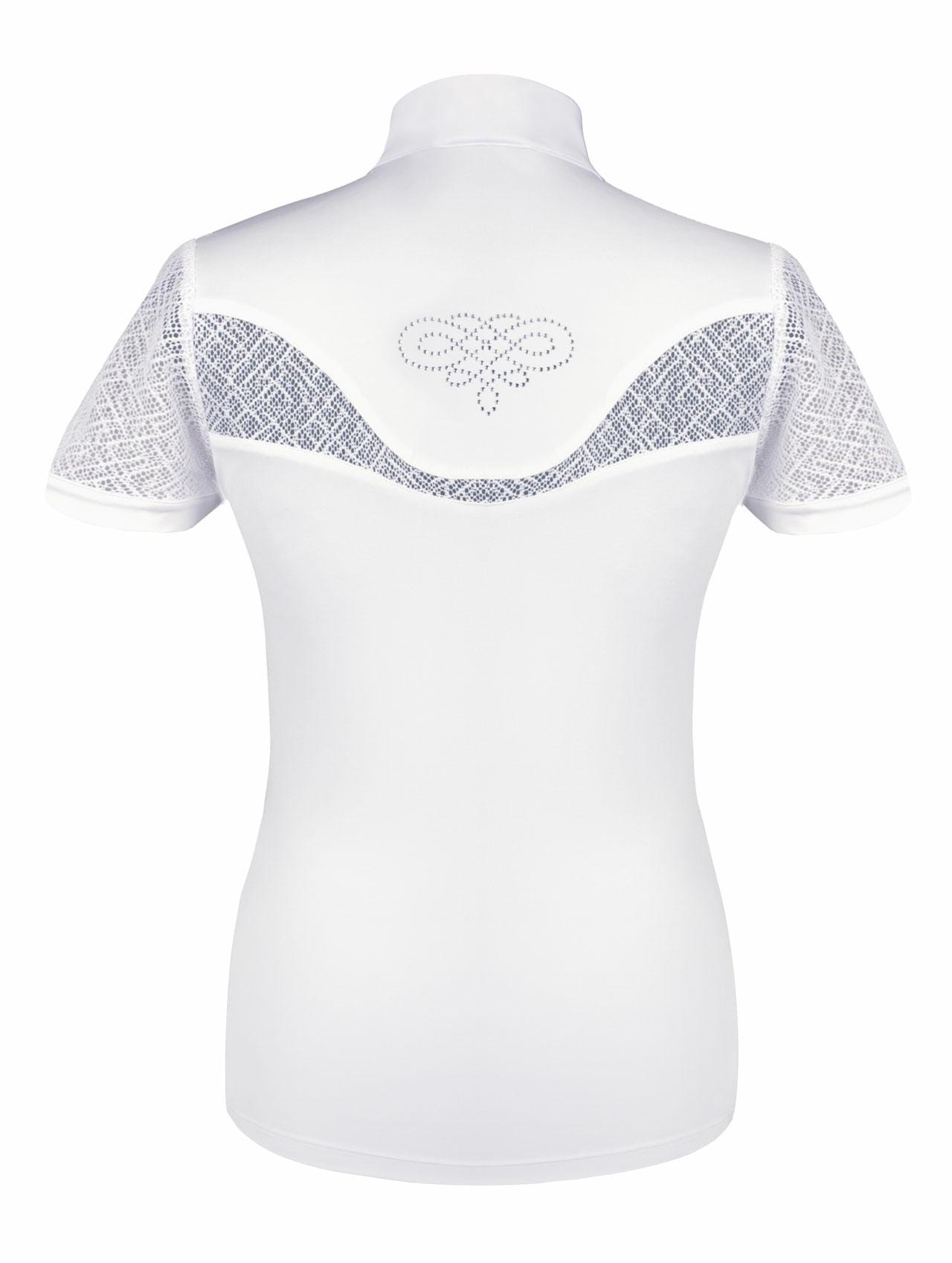 Bardzo kobieca koszulka zapinana na kryształowe napy. Rękawy i wstawki wykonane z eleganckiej koronki. Ozdobiona subtelnym logo oraz aplikacją z dżetów. Wykonana z cienkiej dzianiny technicznej (82%poliester, 18%elastan) doskonale przepuszczającej powietrze i odprowadzającej wilgoć na zewnątrz.