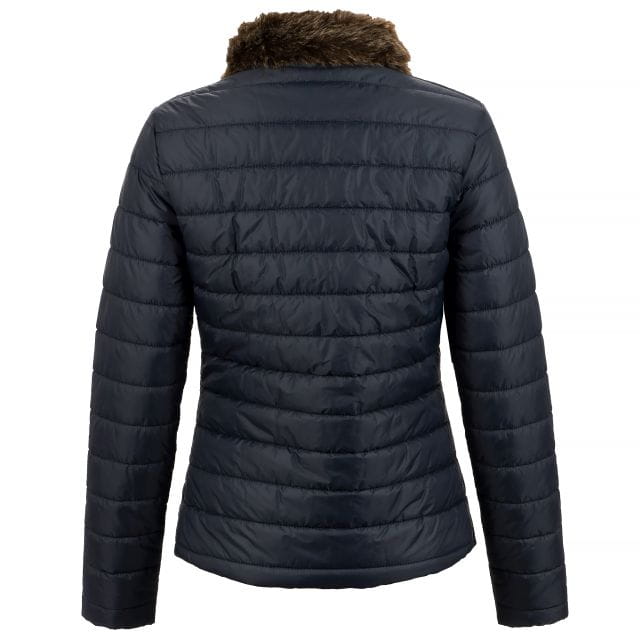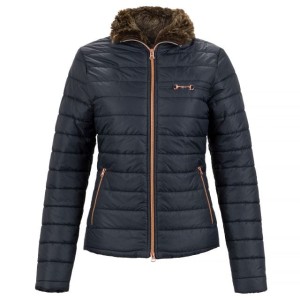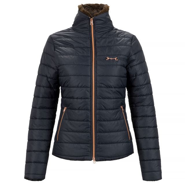 Oryginalna kurtka z lekkim wypełnieniem, wykonana z wodoodpornego i oddychającego materiału w metalicznym odcieniu. Ozdobiona sztucznym futrem na kołnierzu dodatkowo chroniącym przed zimnem. Posiada dwie kieszenie, które pomieszczą najpotrzebniejsze drobiazgi. Zapinana przy pomocy dwukierunkowego zamka w modnym kolorze rosegold. Ozdobiona metalowym wędzidełkiem na piersi również w kolorze różowego złota. Kurtka doskonale sprawdzi się zarówno do stajni jak i na co dzień.