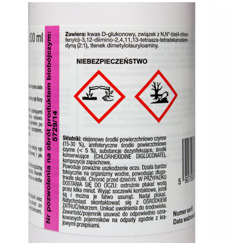 Zawiera: niejonowe środki powierzchniowo czynne (15-30%), amfoteryczne środki powierzchniowo czynne (<5%), substancje dezynfekujące, środki konserwujące (chlorhexidine digluconate, kompozycje zapachowe.