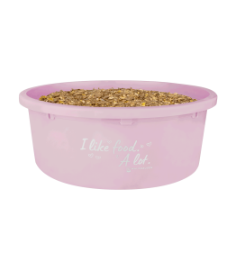 Miska na paszę lub mash dla konia XL z napisem "I like food A lot", z pokrywką , różowa