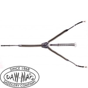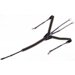 Napierśnik skokowy z wytoczkiem wykonany z trzech elastycznych pasów gumowych połączonych z wytrzymałą i doskonałej jakości skórą. Na części piersiowej posiada miękki podkład z neoprenu zapobiegający obtarciom.