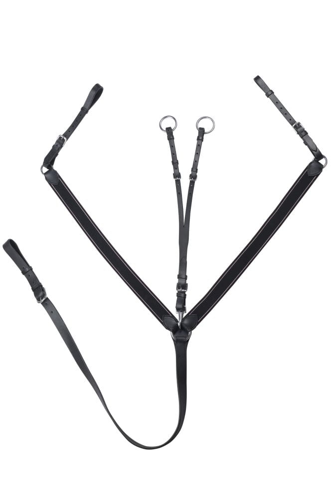 Trzypunktowy napierśnik z wytokiem wykonany z wysokiej jakości skóry bawolej w połączeniu z szerokimi, elastycznymi i mocnymi gumami dla jeszcze lepszego dopasowania. Posiada regulowany, odpinany wytoczek oraz regulację na pasku idącym do popręgu oraz na paskach bocznych. Okucia wykonane ze stali nierdzewnej w srebrnym kolorze. Dostępny jest w dwóch wariantach kolorystycznych: czarny i brązowy. Idealnie sprawdzi się do codziennych treningów jak i na zawody.