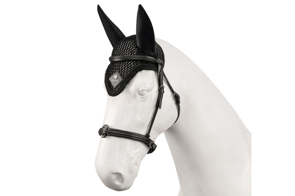 Nauszniki wykonane z miękkiej włóczki, wykończone dekoracyjnym ściągaczem, a dodatkowo ozdobione czarnym sznurkiem, kryształkami i welwetową naszywką z logo Torpol. Są odporne na rozciąganie i mechacenie. Doskonale dopasowane do głowy konia, chroniąc przed uporczywymi owadami oraz redukując dźwięki z zewnątrz.