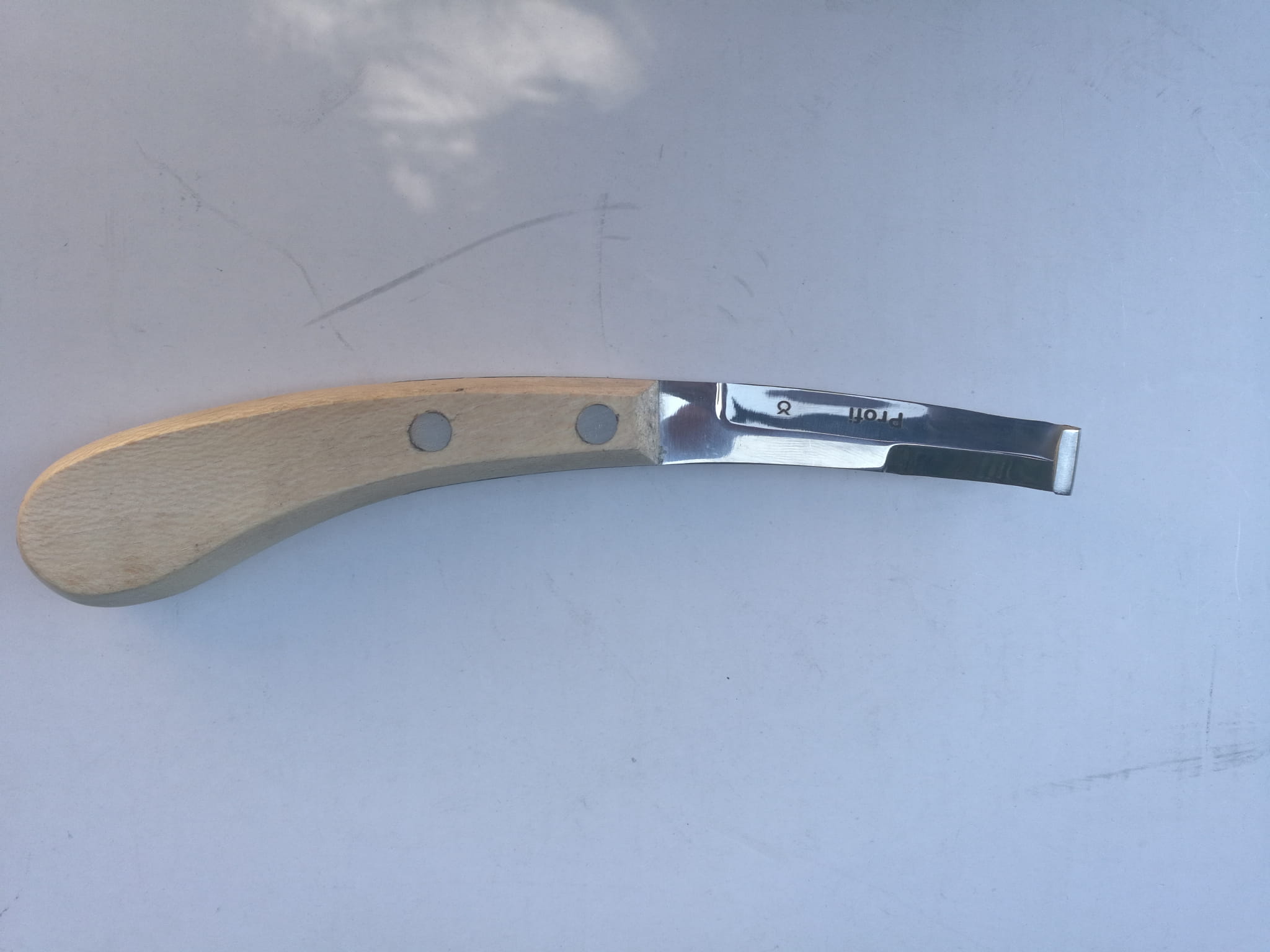 Stalowy nóż do kopyt z drewniana rączką. Posiada obustronne ostrze. Prawy