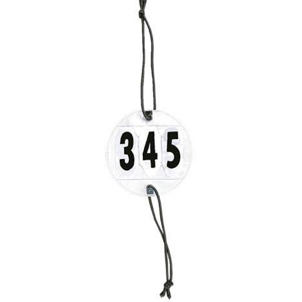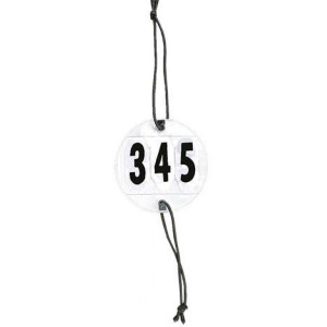 3 cyfrowy numerek startowy w kolorze białym z czarnymi wyraznie widocznymi z daleka cyframi. Dopinany przy pomocy dwóch elastycznych sznureczków.