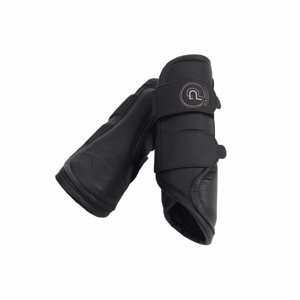 Ochraniacze zapinane są na elastyczne, kryte rzepy z subtelnym, wytłoczonym emblematem Eskadron Platinum. Całość utrzymana jest w minimalistycznej, ponadczasowej czerni, co sprawia, że doskonale pasują do stajennego i turniejowego outfitu.