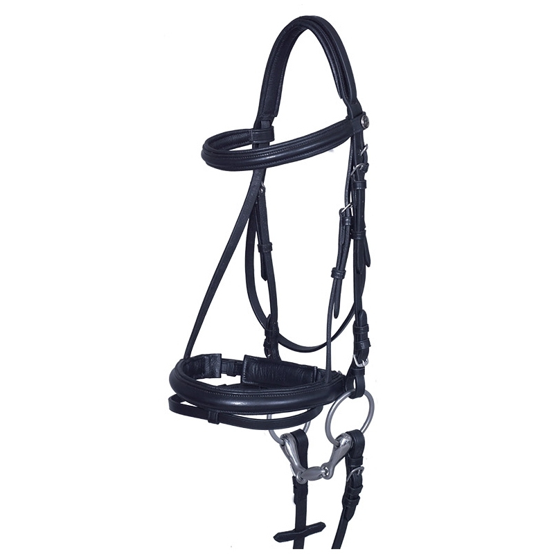 Ogłowie wykonane z wysokiej jakości skóry, z miękkimi podszyciami na nachrapniku, pasku potylicznym oraz naczółku. Nachrapnik zaciskowy, kombinowany z rolkowymi sprzączkami ułatwiającymi płynną regulację. Pasek nachrapnika wychodzi ponad pasek potyliczny, zwiększając tym komfort podczas użytkowania i zapobiega otarciom. Sprzączki w kolorze srebrnym, w komplecie z gumowanymi wodzami.