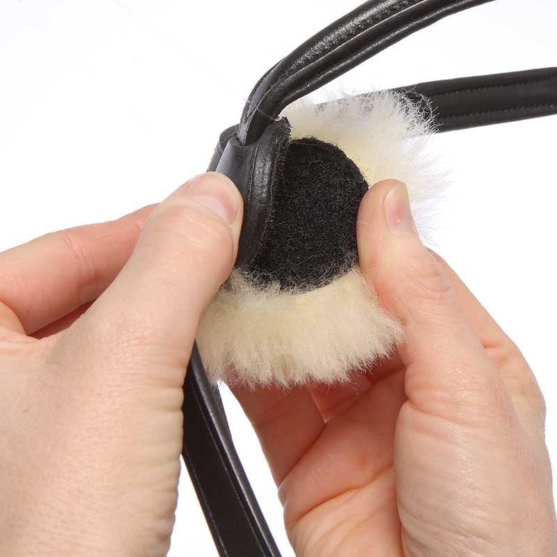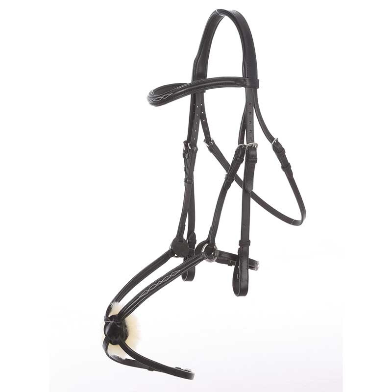Ogłowie wykonane z wysokiej jakości skóry, klasyczne, eleganckie, a jednocześnie bardzo nowoczesne. Miękko podszyte w części potylicznej i nosowej. Nachrapnik meksykański obszyty odpinanym naturalnym futerkiem owczym. Ogłowie posiada eleganckie kontrastowe przeszycia, lekko opadający naczółek. Paski policzkowe zapinane na metalowe haczyki. Ogłowie sprzedawane w komplecie z gumowanymi wodzami ze stoperami. Okucia w kolorze srebrnym.