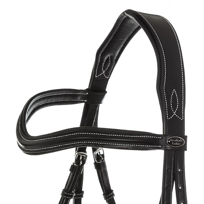 - Eleganckie ogłowie firmy Kavalkade, z kontrastowymi przeszyciami, wyposażone w profilowany, anatomiczny nachrapnik angielski ze skośnikiem.