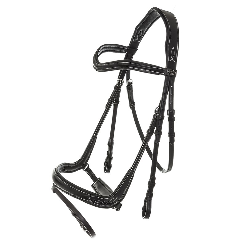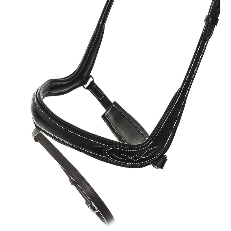 Komfortowe ogłowie wykonane ze skóry wysokiej jakości. Anatomicznie wyprofilowany nachrapnik omija wrażliwe nerwy na pysku konia, dzięki czemu nie dochodzi do ich uszkodzenia. Ogłowie miękko podszyte na potylicy i pasku nosowym. Całość ozdobnie przeszyta kontrastową nicią sprawia, że ogłowie wygląda bardzo efektownie.