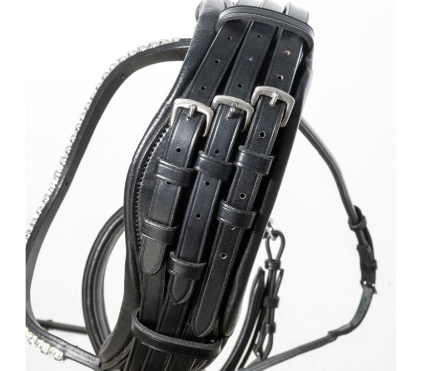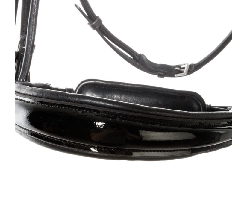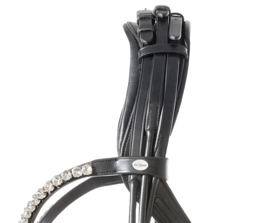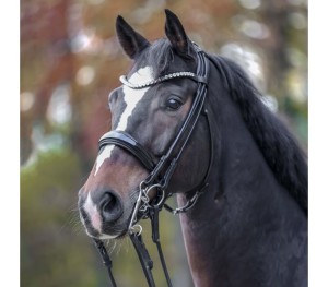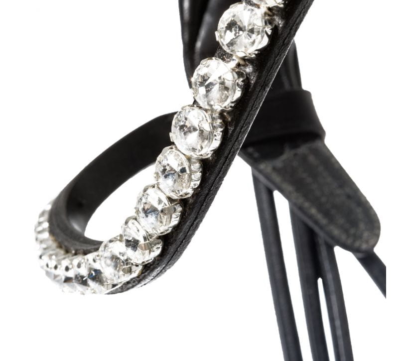 Eleganckie, anatomicznie wyprofilowane ogłowie wykonane w całości z najwyższej jakości niemieckiej skóry. Podgardle oraz paski policzkowe szyte na okrągło " rurkowe", regulowane na szczycie potylicy. Szeroki pasek potyliczny, anatomicznie wykrojony jest miękko podszyty i stanowi całość z paskiem podgardlanym. Szykowny, lekko opadający naczółek jednorzędowy wysadzany dużymi, białymi kryształkami. Miękko podszyty nachrapnik szwedzki z lakierowanej skóry. Ogłowie sprzedawane bez wodzy. Okucia w kolorze srebrnym ze stali nierdzewnej.