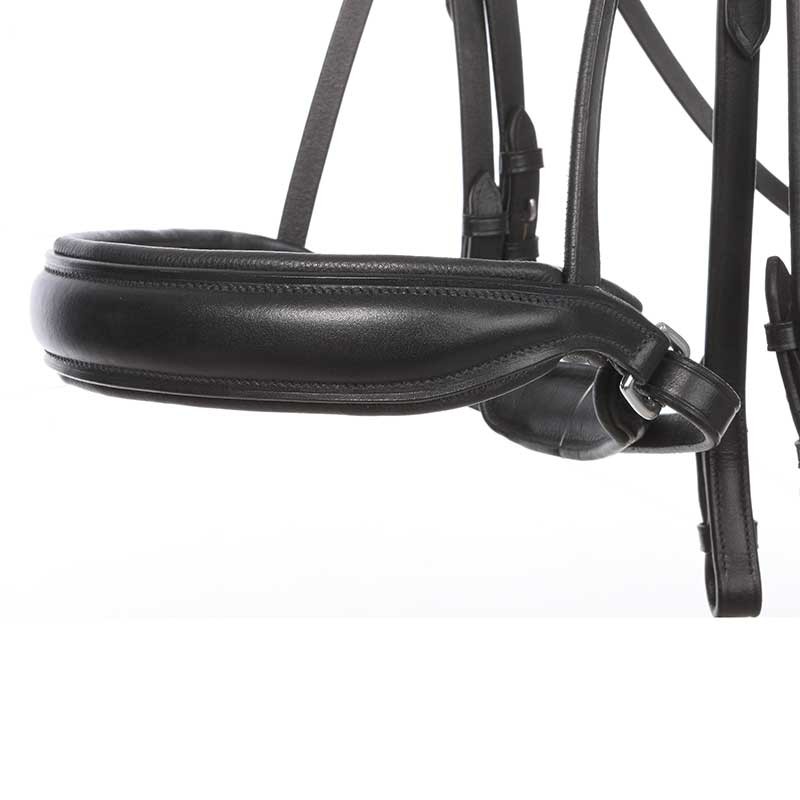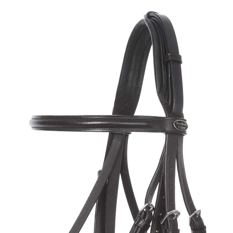 Ogłowie wykonane z wysokiej jakości skóry Ecoline która cechuje się dobrym i solidnym wykonaniem, miękko podszyte w części potylicznej i nosowej. Część potyliczna lekko wycięta co zapewnia swobodę ruchu uszami. Naczółek gładki, ogłowie jest klasyczne ale wspaniale się prezentuje na koniu. Sprzączki wykonane z solidnej stali nierdzewnej w kolorze srebrnym.