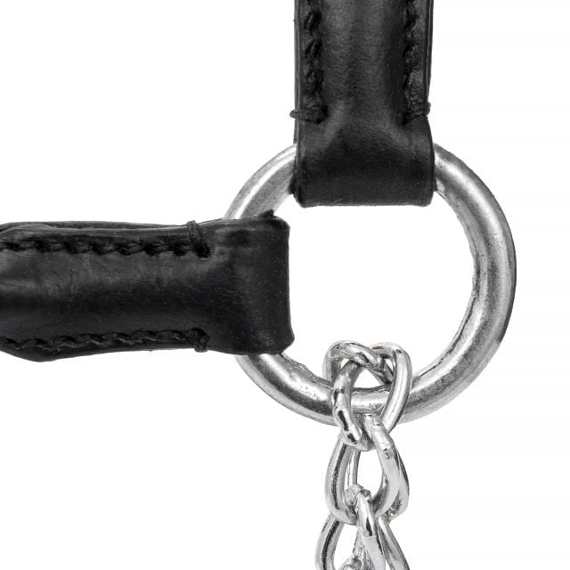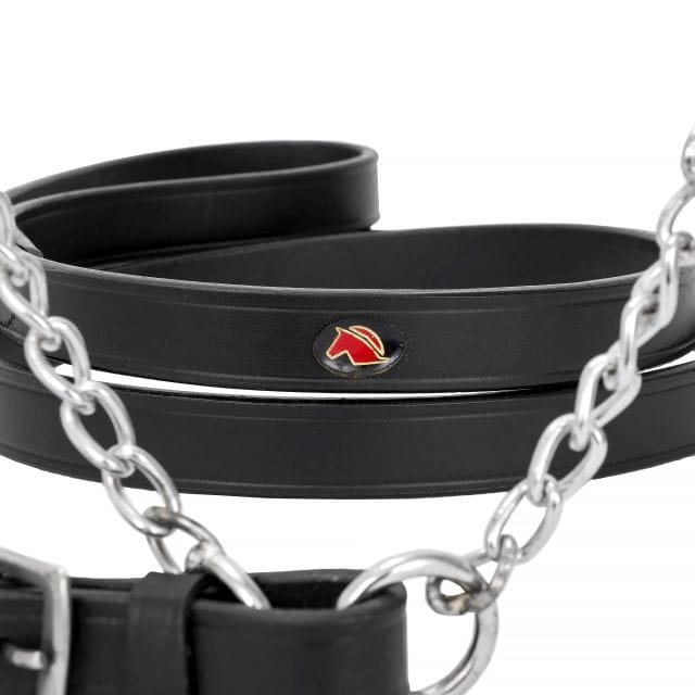 Eleganckie ogłowie prezenterskie, wykonane z wysokiej jakości skóry bydlęcej. Staranne wykończenia gwarantują okazały wygląd. Zaokrąglony pasek potyliczny i nachrapnik z możliwością regulacji (na pasku potylicznym). Solidne sprzączki oraz łańcuszek wykonane ze stali szlachetnej w kolorze srebrnym, nadają mu wytrzymałości. Do ogłowia dołączony jest uwiąz z pętelką w postaci skórzanego paska o długości 160cm.
