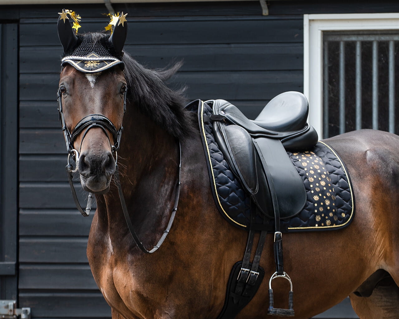 Złota, noworoczna dekoracja przypinana do ogłowia lub do kantara za pomocą rzepów. Ozdoba ma wysokość 15cm i oferowana jest w parze ( 2szt ).