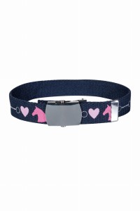 Pasek dziecięcy do spodni z granatowej taśmy parcianej nadrukowanej w serca, wędzidełka i głowy koni. Zapinany na prostą, metalową klamrę z regulacją długości. Rozmiar uniwersalny