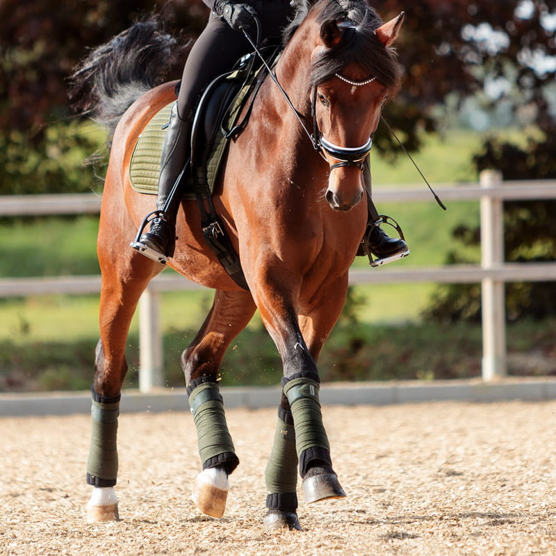 Komfortowe podkładki z miękkiego polaru stanowią idealną ochronę przed nadmiernym uciskiem bandaża. Wykonane z miękkiej tkaniny polarowej z bawełnianym wypełnieniem, są "oddychające" i szybkoschnące. Pikowane wzdłużnie dzięki czemu łatwo przylegają do nogi konia. Zapięcia na rzep zapobiegają przesuwaniu się podkładki i przytrzymują je w odpowiednim ułożeniu.