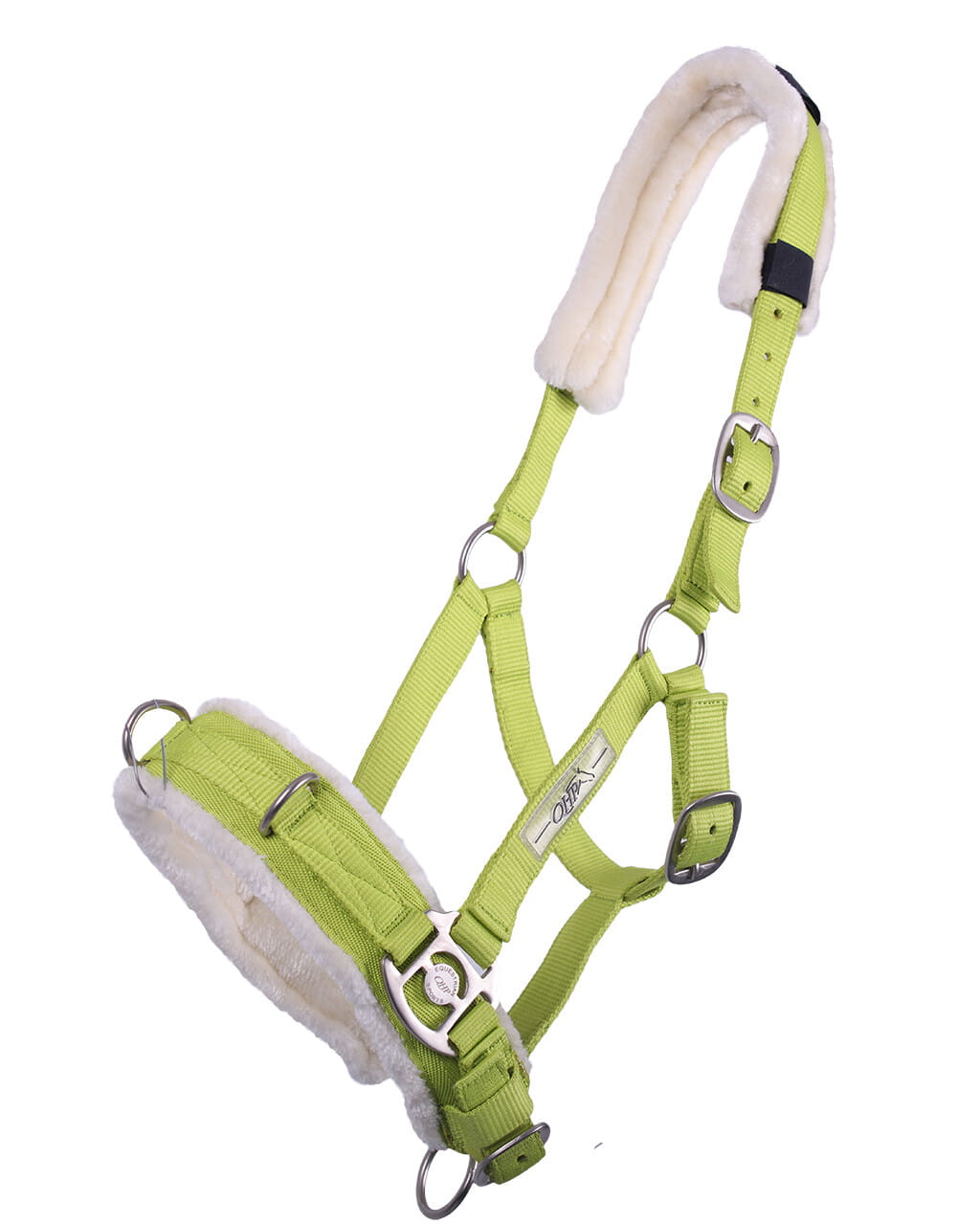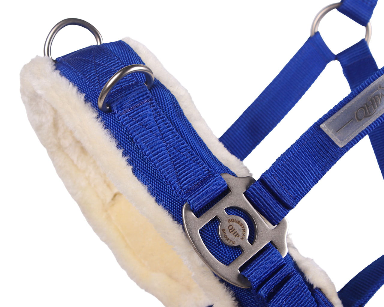 Kolorowy Kawecan QHP wykonany z materiału syntetycznego, posiada 3 metalowe pierścienie typu D w górnej części nachrapnika. Może być stosowany do lonżowania, treningu z ziemi oraz do jazdy bezwędzidłowej. Posiada regulację w trzech miejscach: nachrapnik, pasek pod gardłem, oraz pasek potyliczny. Nachrapnik i pasek potyliczny miękko podszyty sztucznym futerkiem, które z łatwością można odpiąć.