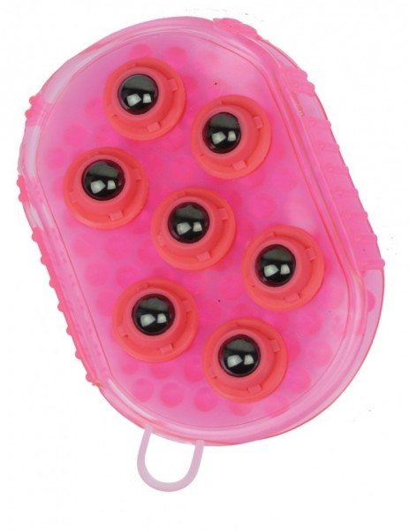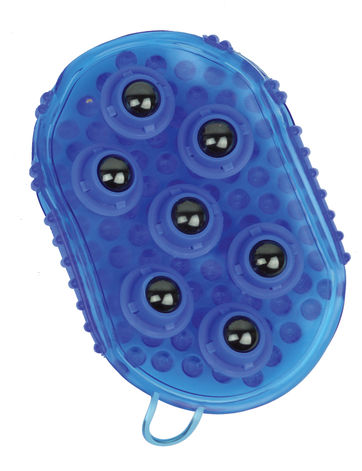Dwustronna gumowa rękawica do masażu konia, po jednej stronie gumowe wypustki z drugiej metalowe kulki masujące.