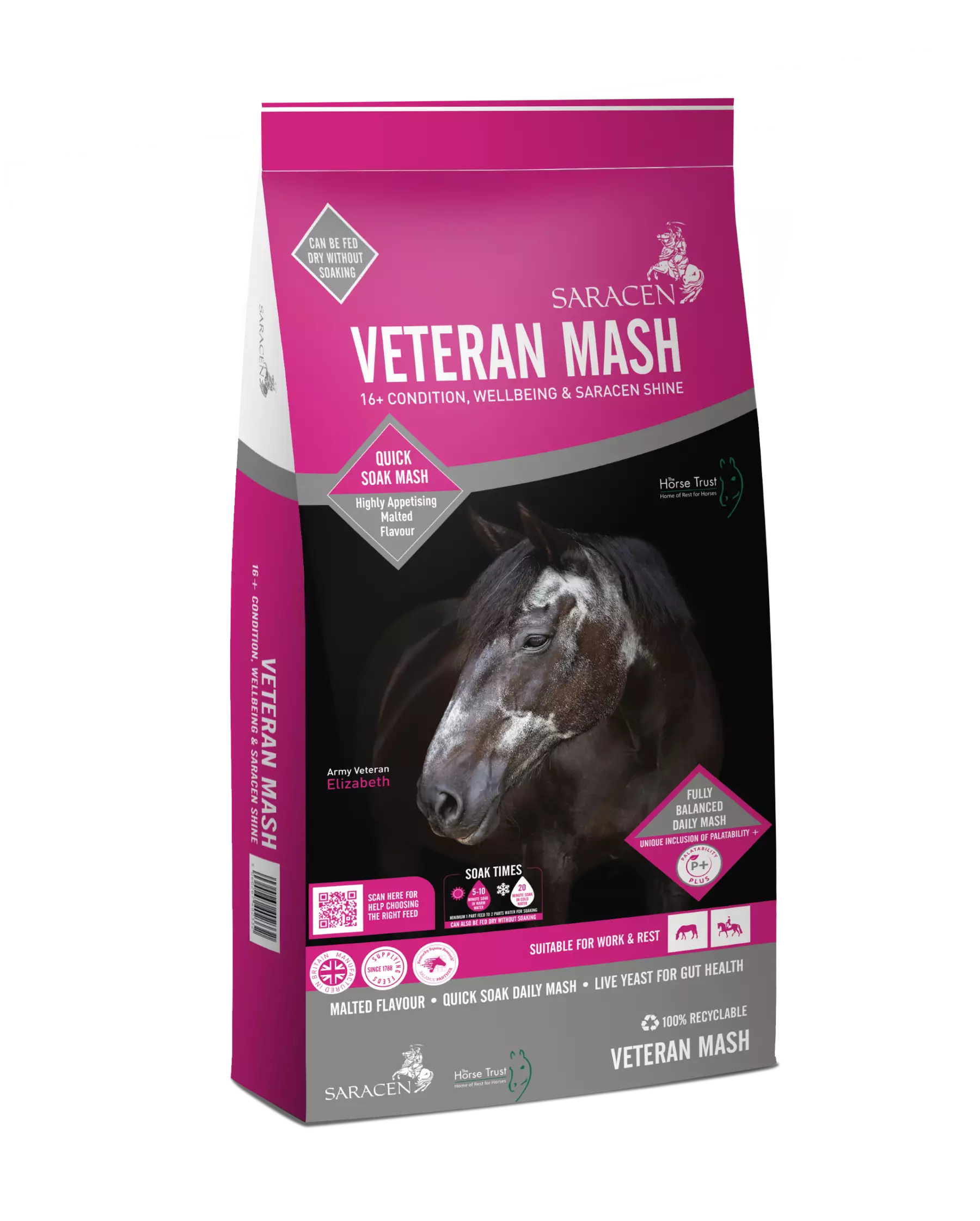 VETERAN MASH został opracowany aby zapewnić optymalne odżywienie koniom i kucom, które osiągnęły wiek kiedy mogą potrzebować specjalistycznego żywienia i większej ilości kalorii w celu utrzymania optymalnej kondycji ciała.