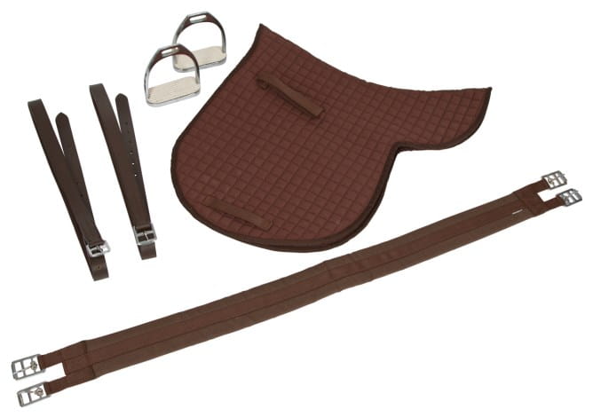 Tanie siodło skórzane do jazdy konnej w komplecie z czaprakiem, strzemionami, puśliskami i popręgiem - czarne, brązowe