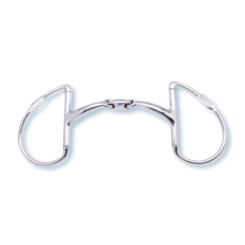Wędzidło 2x łamane z innowacyjnym pierścieniem typu "D", którego konstrukcja ułatwia kontrolowanie konia. Posiada możliwość alternatywnego podpięcia wodzy dzięki otworom w pierścieniach. Szerokość ścięgierza 14mm, pierścienie - 100x55mm