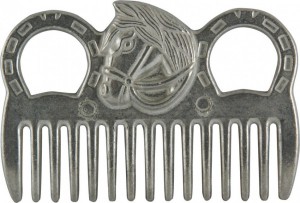 metalowy grzebień z głową konia i podkowami do rozczesywania